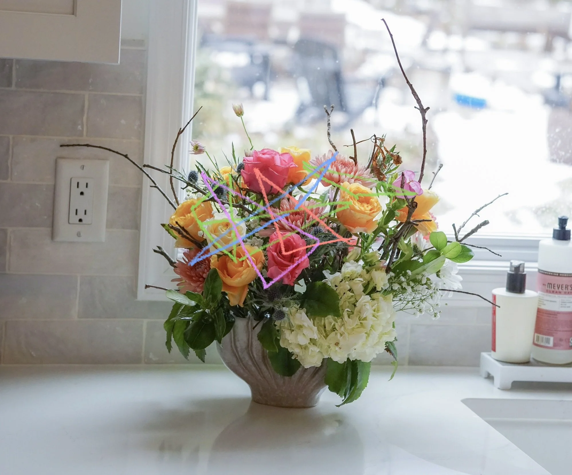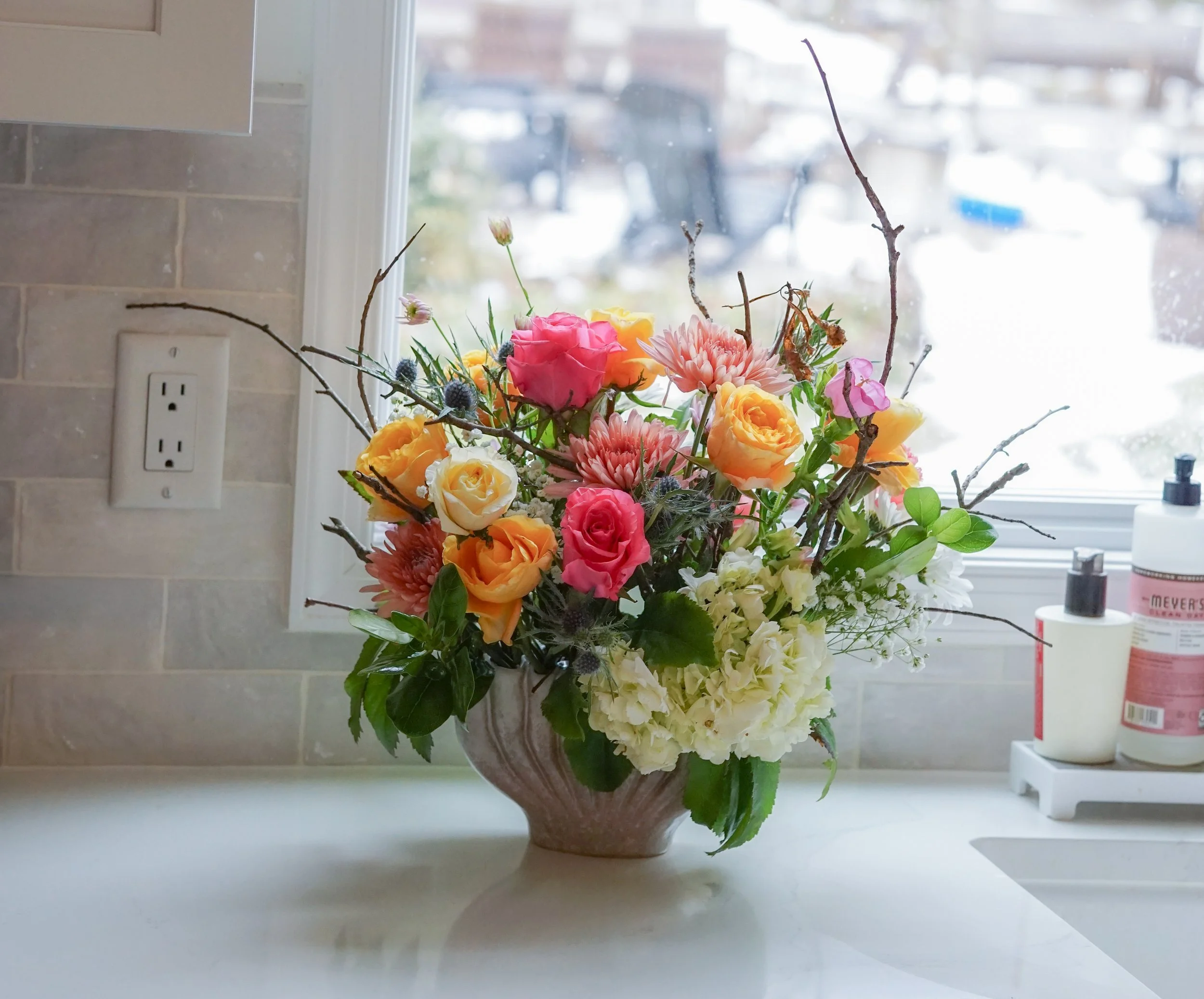 On a chilly mid-February day, I got home from Trader Joe’s and plopped a pre-built flower bouquet and a bouquet of yellow roses on the counter in front of my mother-in-law. “Maureen… could you transform this into something beautiful?” I asked. All she would have access to was our limited supply of floral tools, our backyard, and these bouquets (which in total I think were somewhere between $15 - $20). Maureen was more than up to it.