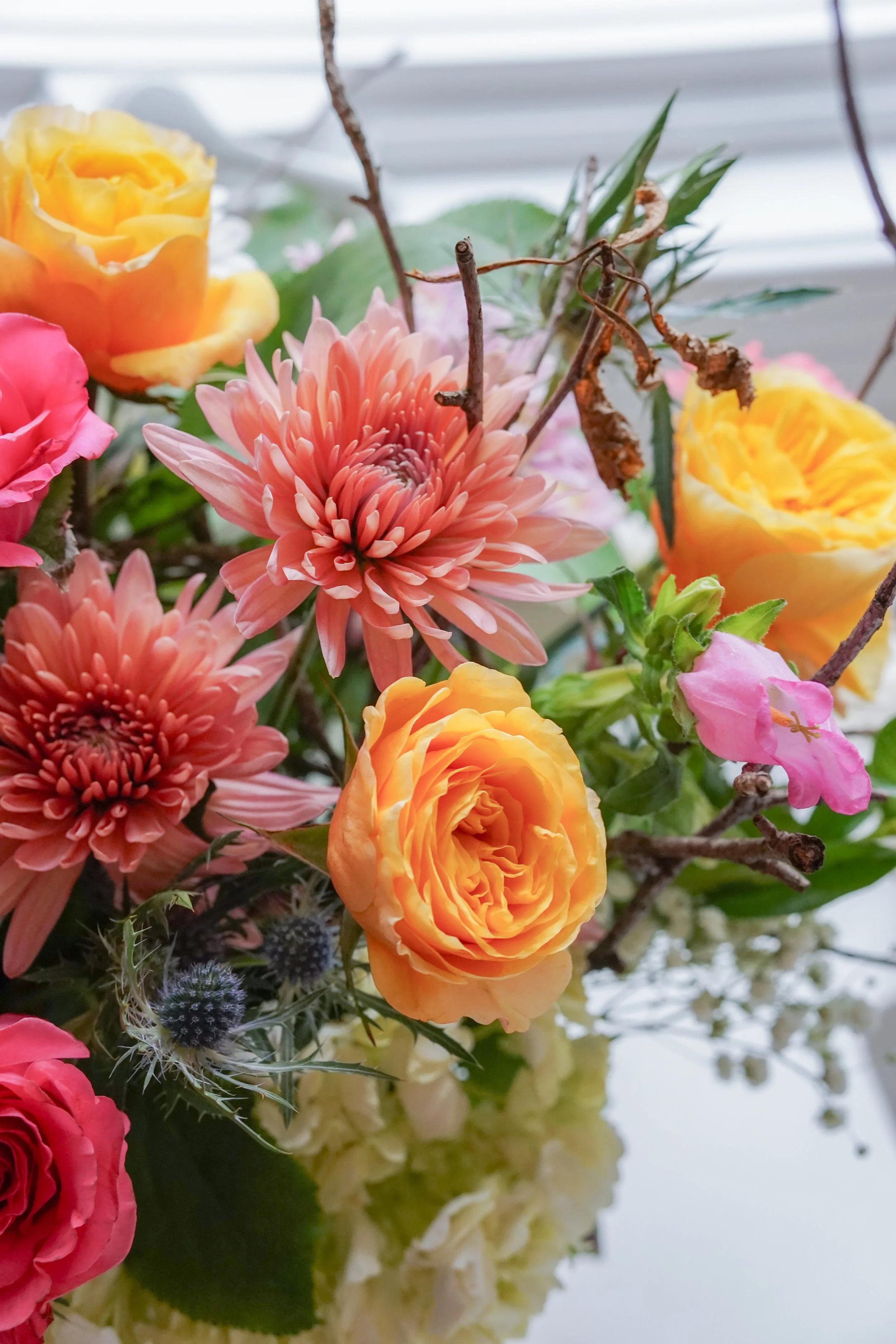 Think about your colors! Maureen was very glad I had bought the yellow roses. Without these, the arrangement might have been a little bland. I remember hearing a tip from florist Sarah Raven last year to use when picking colors: “you want a bride, bridesmaids, and wedding crasher.” This basically means, you want to have some similar colors that complement each other, but also something that contrasts and brings everything to life. The yellow roses did this for us.