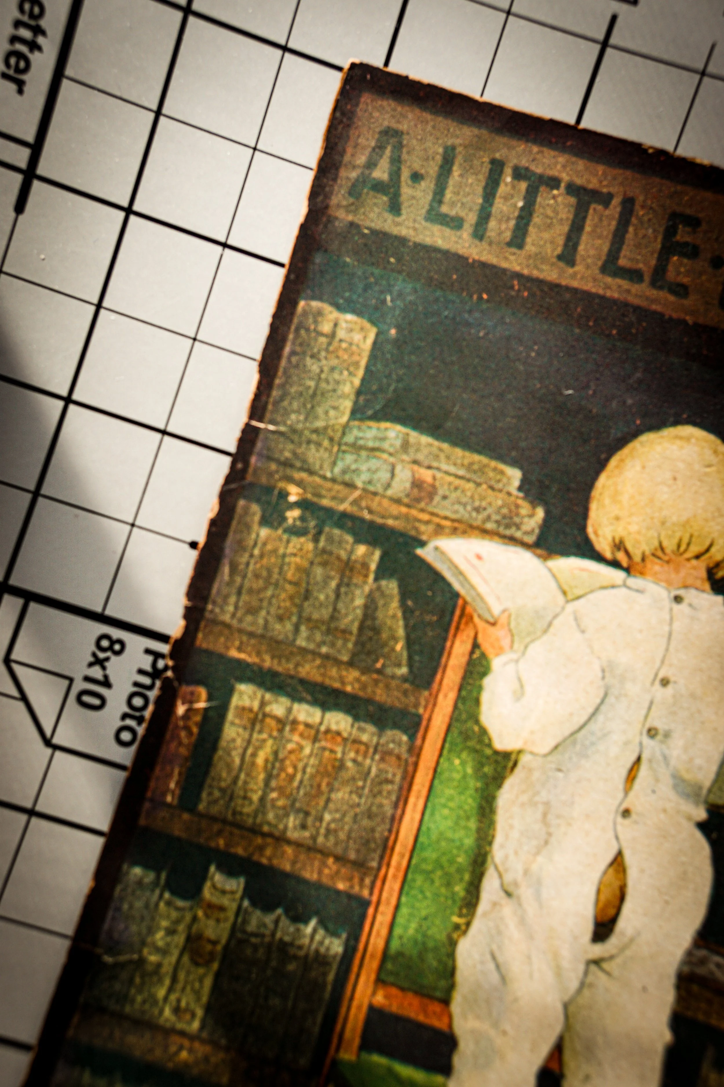 A Little Bookworm was produced in 1906 by the Ullman Manufacturing Group. There’s a little stamp with the name in date in the bottom left corner of the print. From the late 1800s through the early 1900s, the Ullman Manufacturing Group produced prints, postcards, puzzles, and more. The artist of this particular print was most likely Katherine Greenaway.